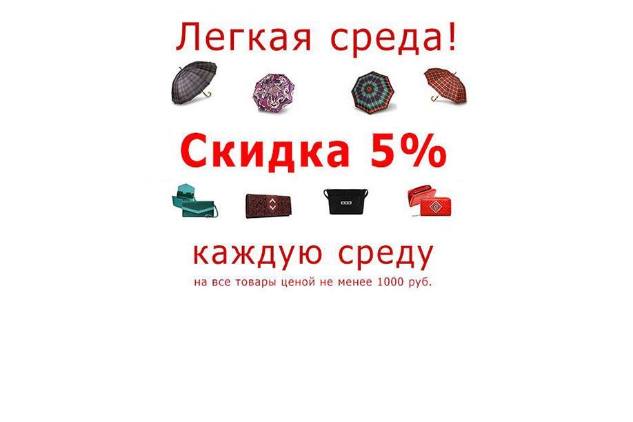 Говорят, что среда - это маленькая пятница. Чтобы порадовать наших клиентов каждую среду дарим покупателям нашего интернет магазина скидку 5% на все товары стоимостью более 1000 руб.